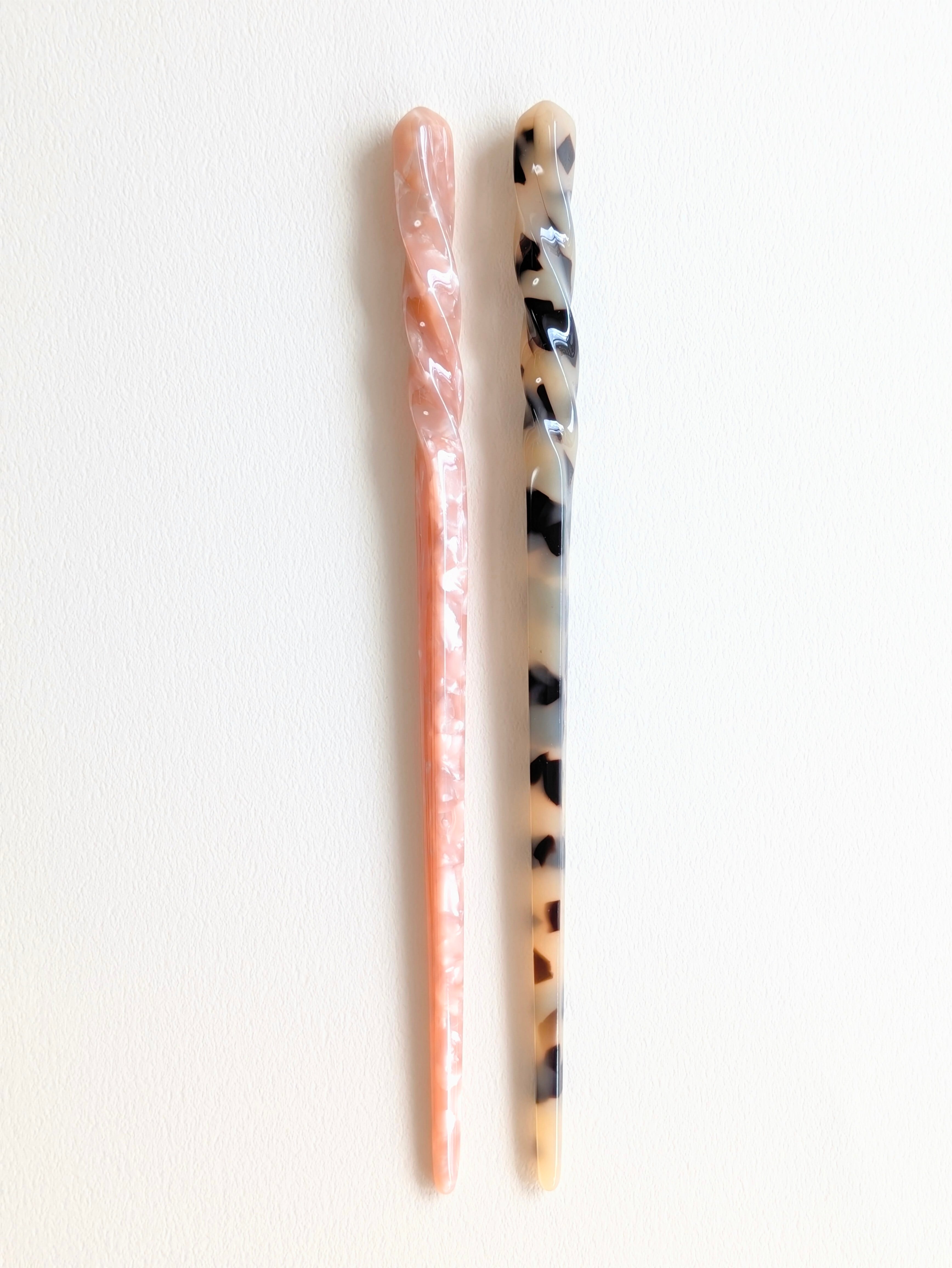 マーブル模様と洗練された螺旋状のツイストデザインがおしゃれな簪。スクエア型で幅6mmと太めのため、1本でしっかり留まるおすすめの1本です。