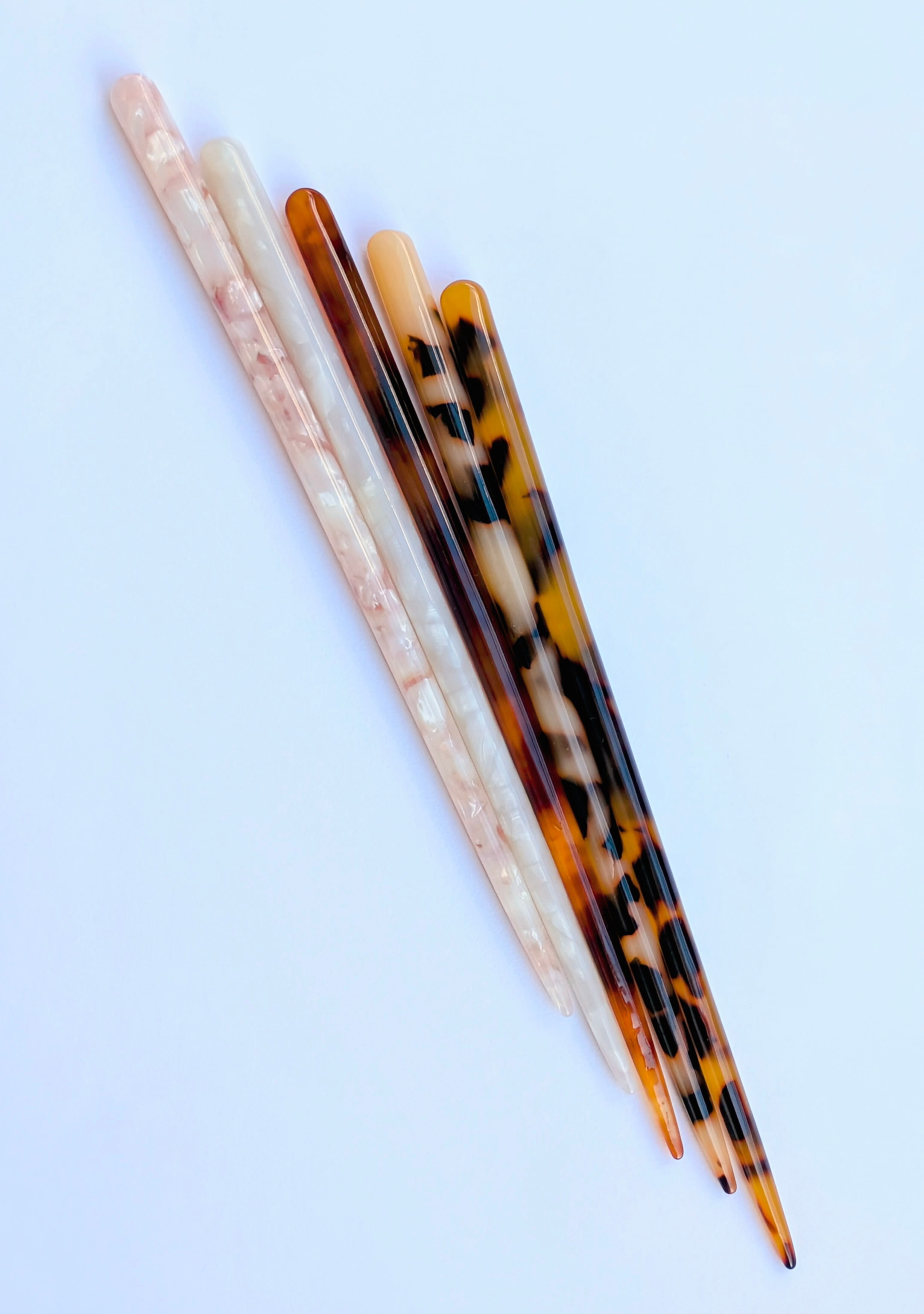 スーパーロングヘアもすっきりまとめ髪できるように、髪全体を上下に分け簪2本で留めるアレンジをお楽しみいただけるように、今回2本セットとしました。