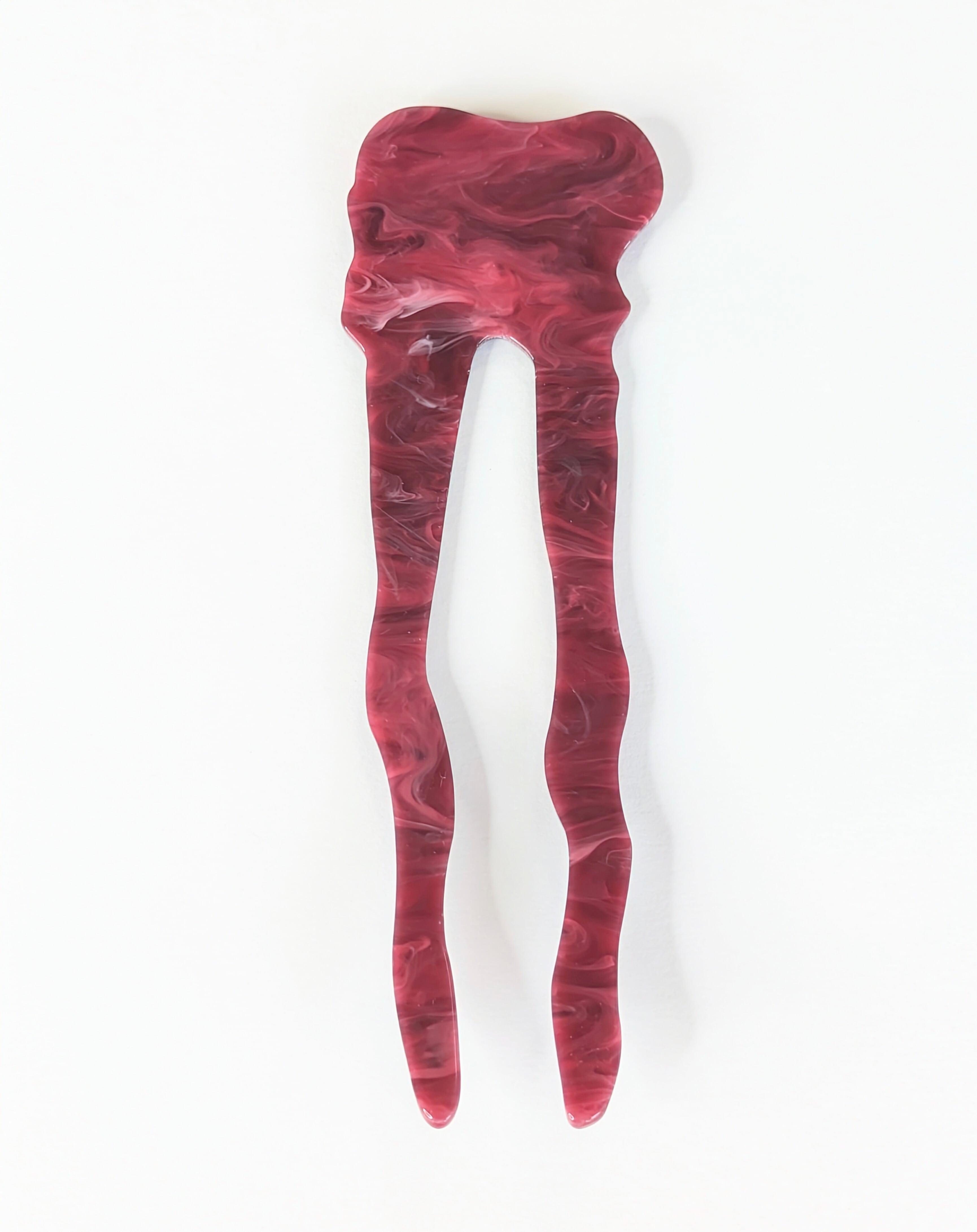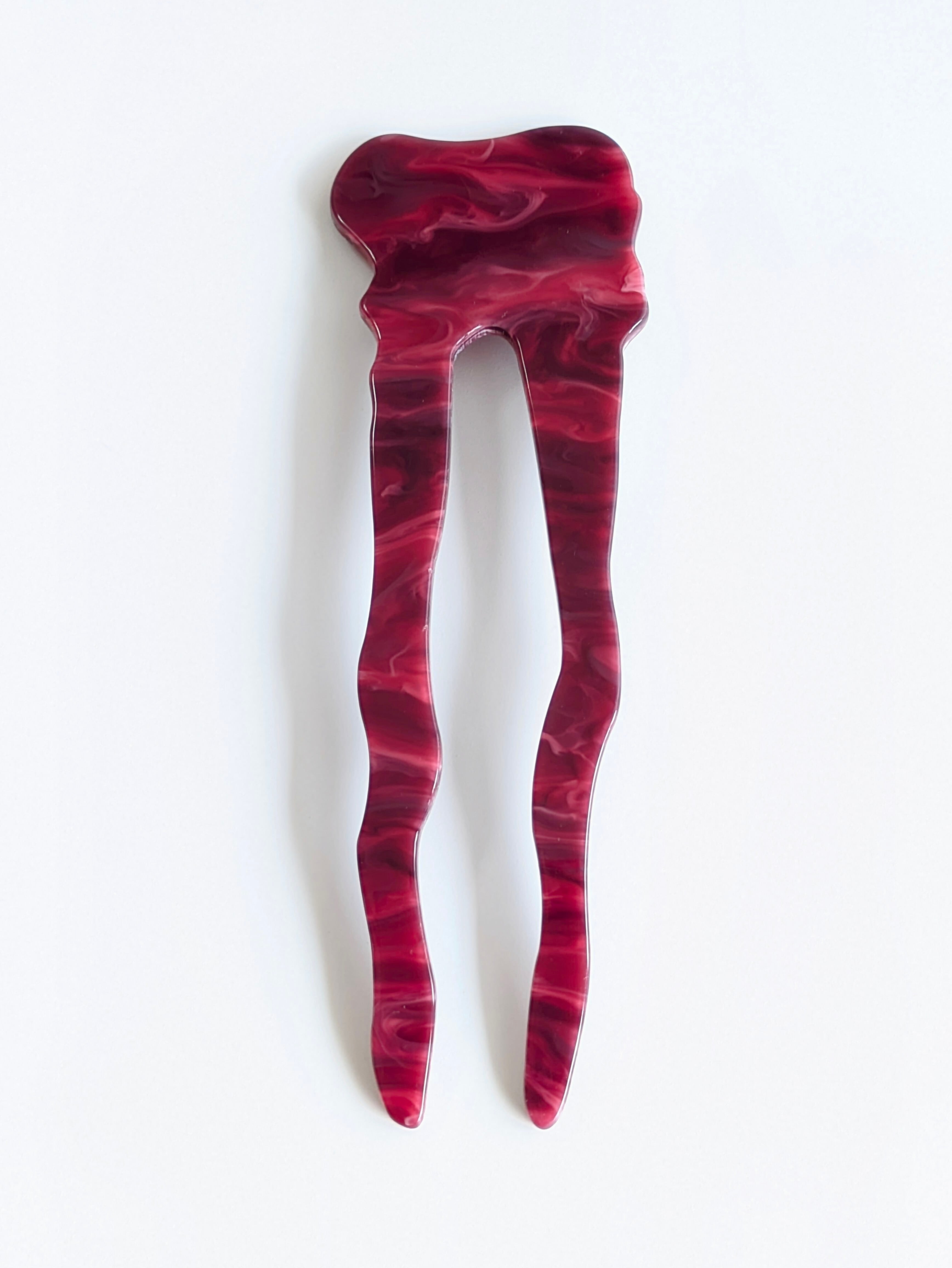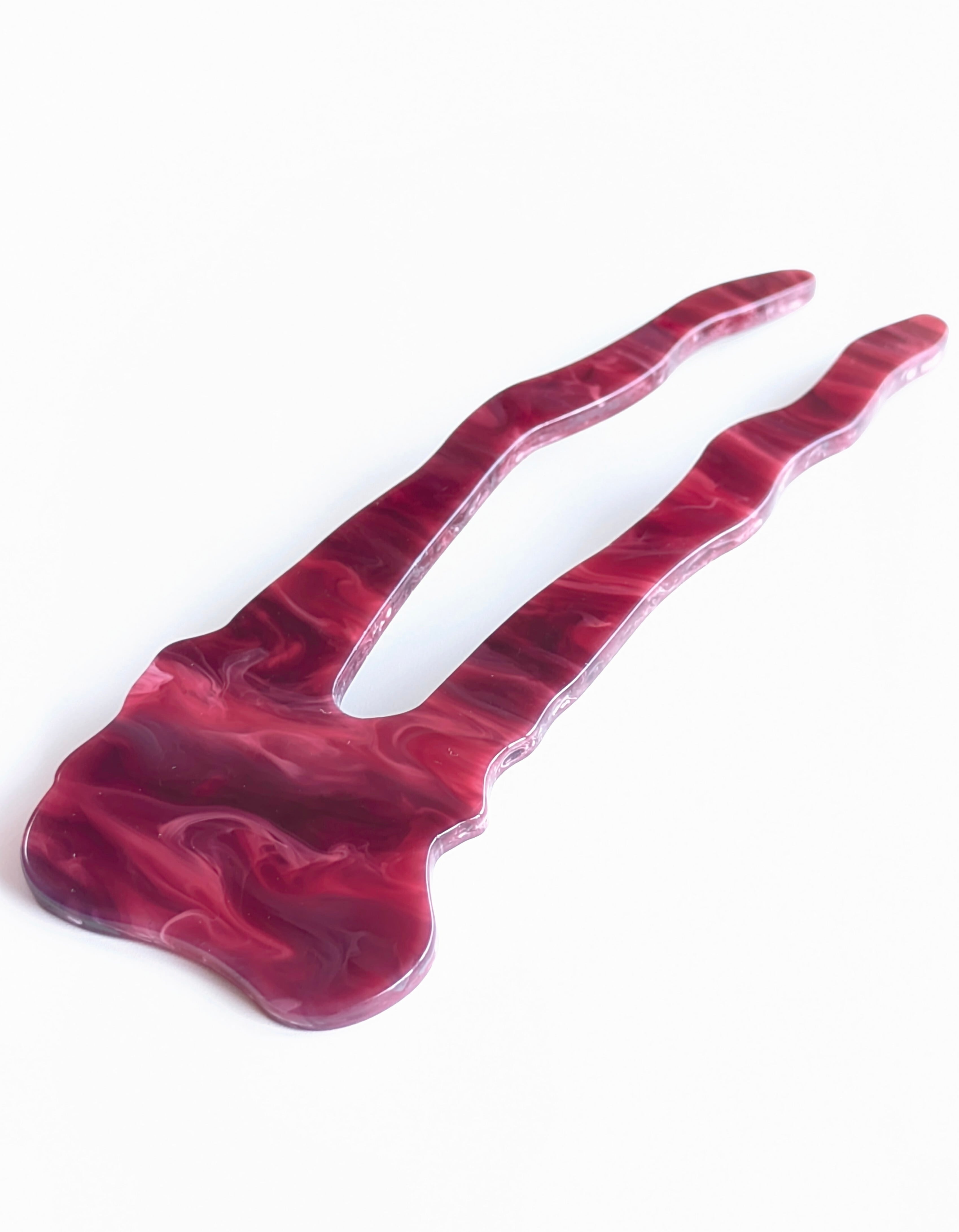 【2本セット】ウェーブヘアスティック&マーブル二股かんざし(ホワイト系・バーガンディ)